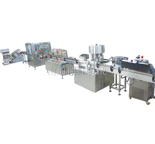 該聯(lián)動(dòng)線(xiàn)適用于30-500ml 的糖漿等液體進(jìn)行理瓶、氣洗、灌裝、封口和鋁箔封口、貼標(biāo)。通過(guò)氣洗機(jī)、理瓶機(jī)、灌裝機(jī)、封口機(jī)、不干膠貼標(biāo)機(jī)組成聯(lián)動(dòng)線(xiàn),也可單機(jī)使用。灌裝部份采用定量柱塞泵灌裝,當(dāng)灌裝頭壓至瓶口時(shí),液體通過(guò)計(jì)量泵自動(dòng)送至瓶?jī)?nèi)。當(dāng)無(wú)瓶時(shí)灌裝頭上部閥芯不工作,使液體通過(guò)回流腔自動(dòng)流入儲(chǔ)液桶里,確保無(wú)瓶不灌裝。本機(jī)組采用PLC、觸摸屏聯(lián)動(dòng)聯(lián)控及普通電器聯(lián)控二種,機(jī)構(gòu)合理,自動(dòng)化程度高,對(duì)各種規(guī)格的瓶類(lèi)適應(yīng)性強(qiáng)。